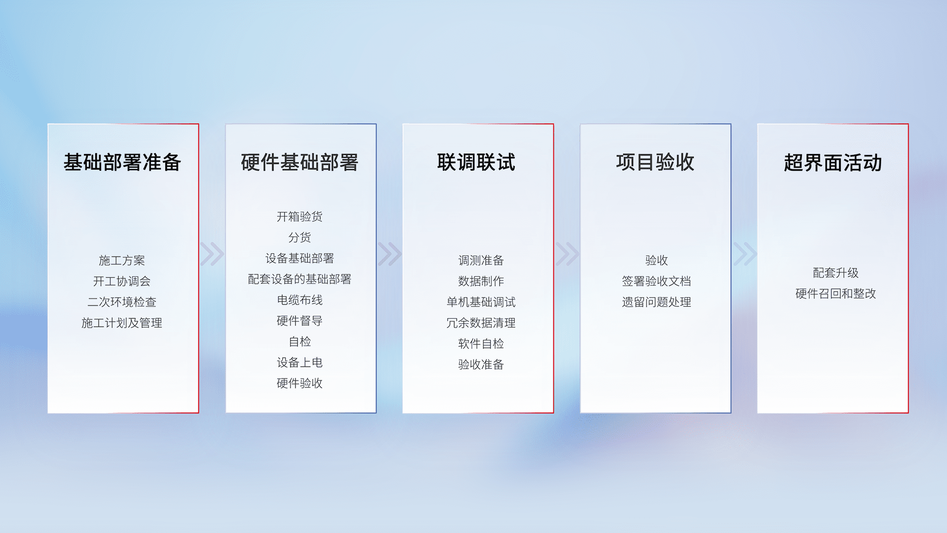 从基础部署准备、、、、硬件基础部署、、联调联试、、、项目验收、、越界面活动的全过程可追溯,,保证施工质量和进度。。